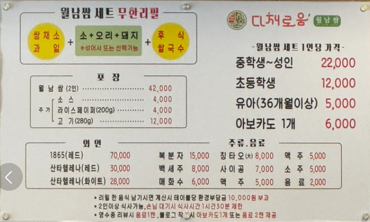 메뉴는 월남쌈 세트가 중심이고, 고기·새우·쌀국수까지 다양하게 구성되어 있었어요. 2인~4인 세트 구성도 잘 되어 있어 선택이 쉬웠고, 가격도 부담 없는 편이었답니다.